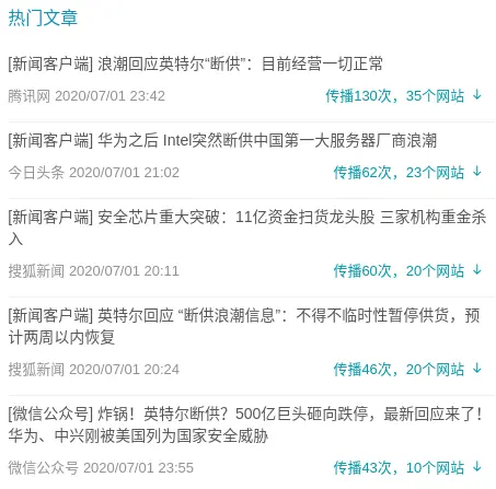 《华为之后 Intel突然断供中国第一大服务器厂商浪潮》、《安全芯片重大突破:11亿资金扫货龙头股 三家机构重金杀入》、《英特尔回应 “断供浪潮信息”:不得不临时性暂停供货,预计两周以内恢复》和《炸锅!英特尔断供?500亿巨头砸向跌停,最新回应来了!华为、中兴刚被美国列为国家安全威胁》等文章重点强调了浪潮和英特尔方面的回应。