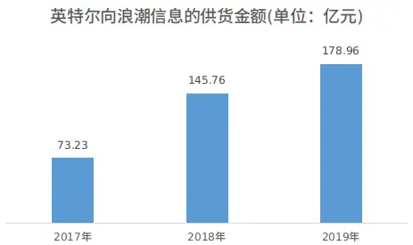 浪潮和英特尔在服务器领域的合作由来已久。2006年11月,浪潮和英特尔签署《服务器长期深层技术合作备忘录》,自此正式进入服务器产业核心圈。之后的十余年内,英特尔向浪潮的供货比例逐年攀升。浪潮信息年报显示,2017年~2019年,英特尔向浪潮信息的供货金额从73.23亿元增至178.96亿元,采购占比从29.94%上升到37.53%,年同比增速分别达到99%、23%。