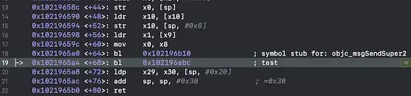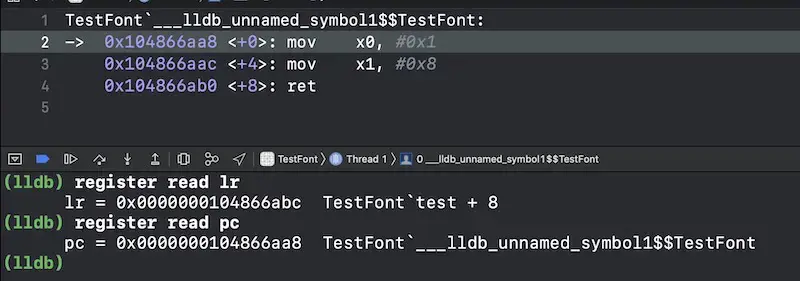 - 执行完test()函数,发现程序跳转到了lr寄存器所保存的指令地址,也就是0x00000001021965a8,此时再次查看lr和pc寄存器的值,发现pc寄存器存放的地址已经变成了lr寄存器存放的地址