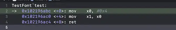 pc = 0x0000000102196abc TestFont`test