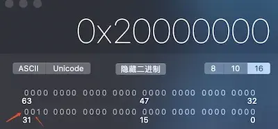 可以发现,在执行cmp操作之后,cpsr寄存器的值变成了0x20000000,转换成16进制后,得到32位标志位如下