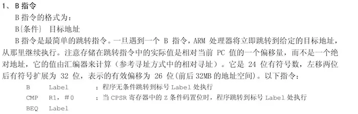 B指令是最简单的跳转指令,一旦遇到B指令,程序会无条件跳转到B之后所指定的目标地址处执行。