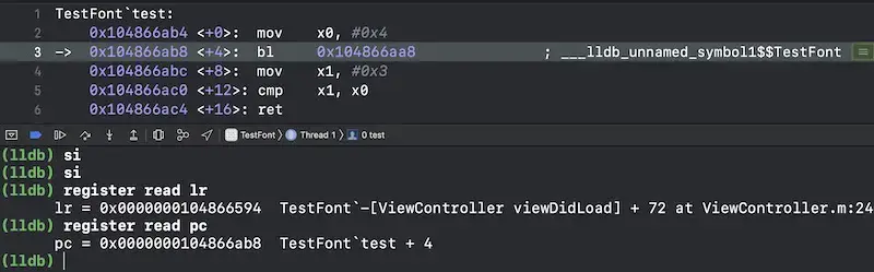 - 在viewDidLoad中调用test()函数,然后在LLDB中使用register read x0 读取寄存器中存放的值