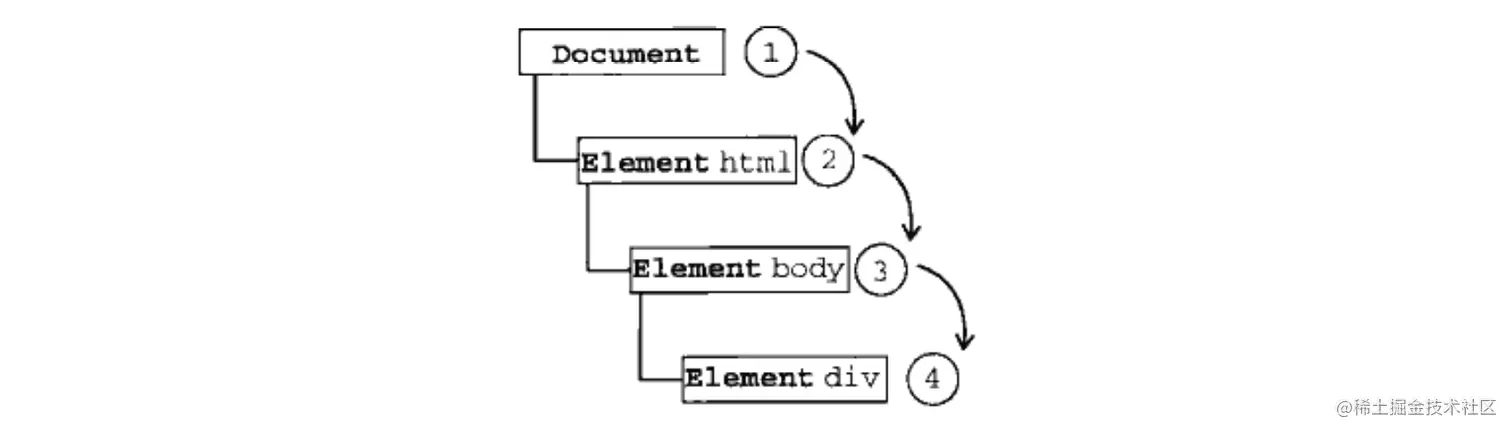 Netscape Communicator团队提出的另一种事件流叫做事件捕获。事件捕获的思想是不太具体的节点应该更早接收到事件,而最具体的节点应该最后接收到事件。用上面的html结构举例,如果你点击了div,那么这个click事件会按照如下顺序传播: