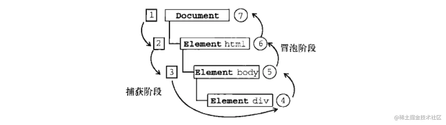 如果你点击了div,那么这个click事件会按照如下顺序传播: