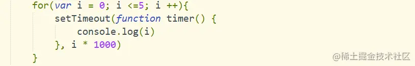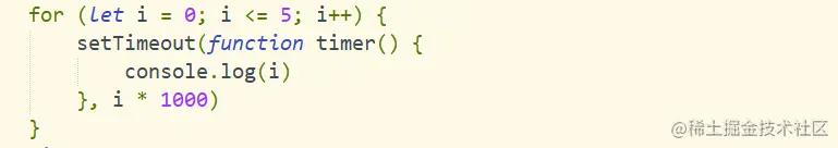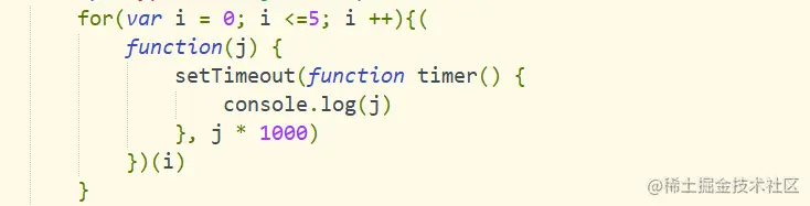 首先,我们先使用一个立即执行函数(function(){}()将i传入到函数内部,这个时候值就会固定在参数j上面且不会发生改变,当下次执行timer这个闭包的时候,就可以使用外部函数的变量j,从而实现如下👇效果