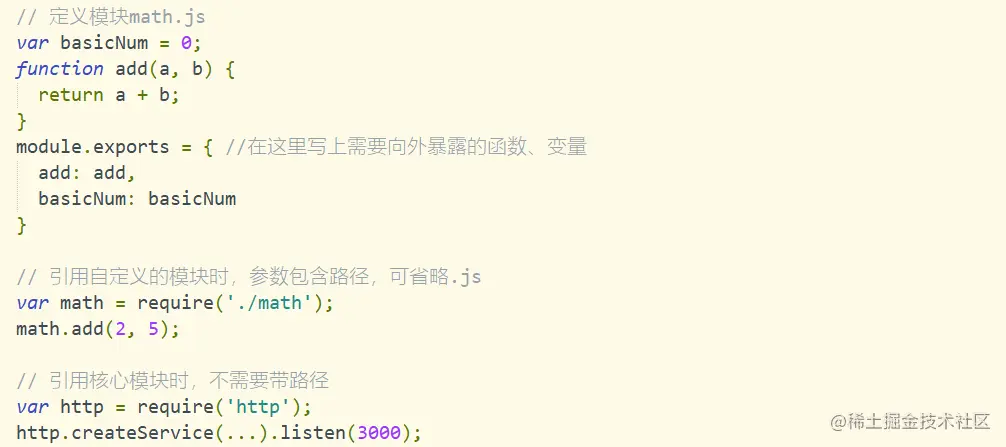 有四个重要的环境变量为模块化的实现提供支持:module、exports、require、global。实际使用时,用module.exports定义当前模块对外输出的接口(不推荐直接用exports),用require加载模块。