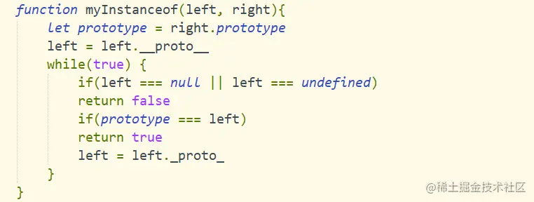 - 循环判断对象的原型是否等于类型的原型,直到对象原型为null,因为原型链的最终为null