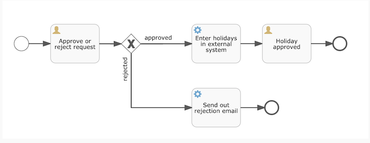 如果批准,则需要将申请注册至某个外部系统,并跟着另一个用户任务,将经理的决定通知给申请人。当然也可以改为发送邮件。