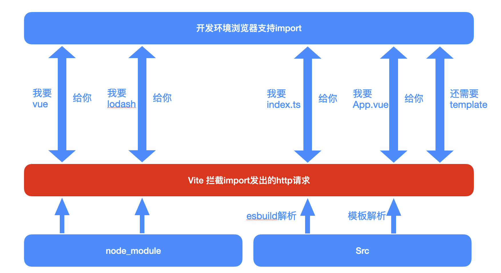 大致的原理就是拦截import发出的http请求,返回浏览器的代码,也保留了import语法,让浏览器自己去处理依赖 script type module 支持import,让浏览器处理es6 import的活,好处就是当前页面引用多少,编译多少,项目越大优势越大