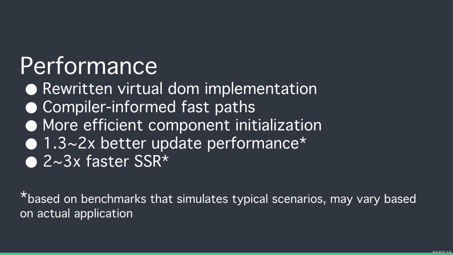 SSR相比于vue2有2~3倍的差距,会客厅当时说到这一点,尤大对ssr的新实现,还是非常得意的 vue3能静态字符串化的 全部静态字符串,只有一个buffer,vue2之前就算是字符串, 内部还是有虚拟节点的处理逻辑