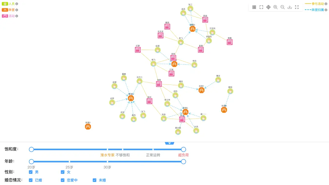上图是一个图可视化应用的综合案例场景,展现了一组虚拟的组织结构关系,可以进行数据校验、关系推理。图中,我们可以根据不同的场景需求,对人员、阵营、活动这三种不同的分类进行过滤,也可以根据实体的属性如性别、年龄层次、兴趣偏好等,筛选出自己想要的结果,如组织中的人员年龄结构、男女分布比例等。