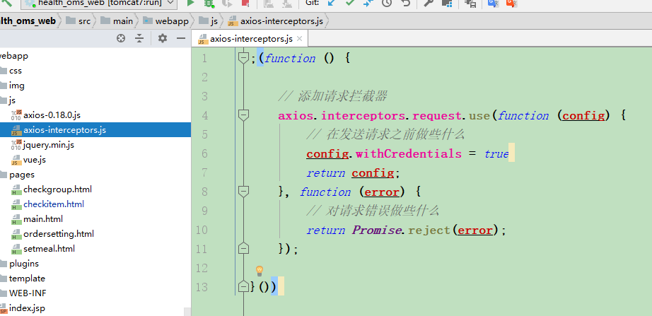 ;(function () { // 添加请求拦截器 axios.interceptors.request.use(function (config) { // 在发送请求之前做些什么 config.withCredentials = true return config; }, function (error) { // 对请求错误做些什么 return Promise.reject(error); }); }()) -
