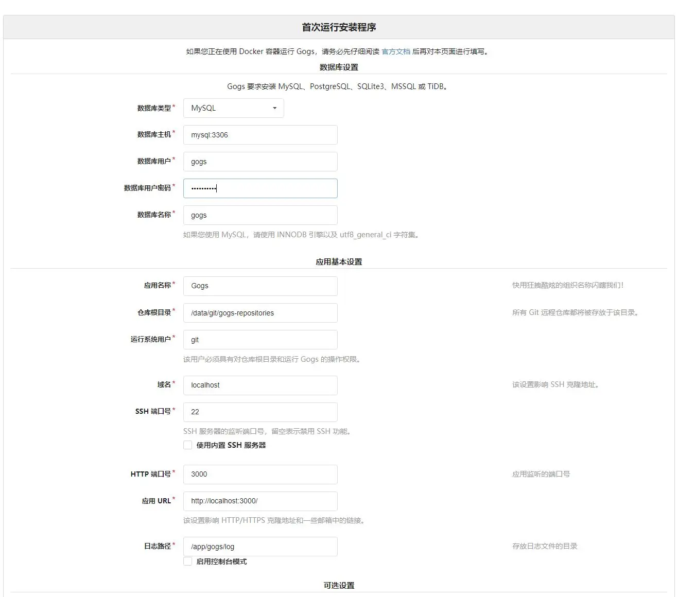 配置好数据库权限后,用浏览器打开http://ip:6023进行 Gogs 的安装。