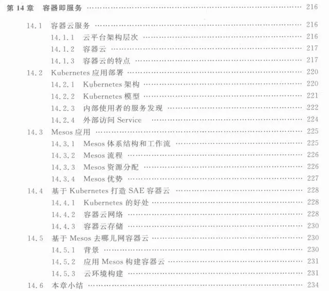 第14章容器即服务,介绍云计算环境中的CaaS(Container as a Service), 简述Kubernetes和Mesos容器调度框架,分析互联网公司SAE容器云和互联网公司“去哪网”容器云。