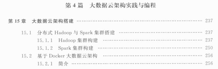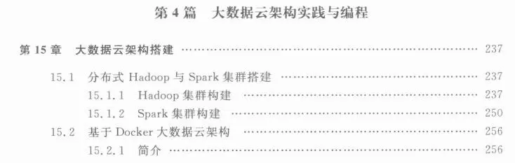 第15章大数据云架构搭建,介绍分布式的Hadoop与Spark集群搭建和基于Docker容器的Spark大数据云架构。