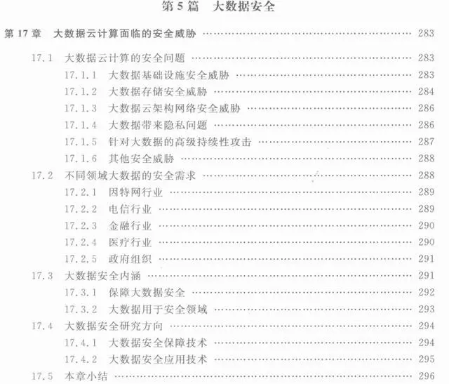 第17章大数据云计算面临的安全威胁,介绍大数据云计算面临的各种安全威胁,阐述不同行业大数据安全的需求,指出大数据安全应该包括保障大数据安全和大数据用于安全两个层面的含义。
