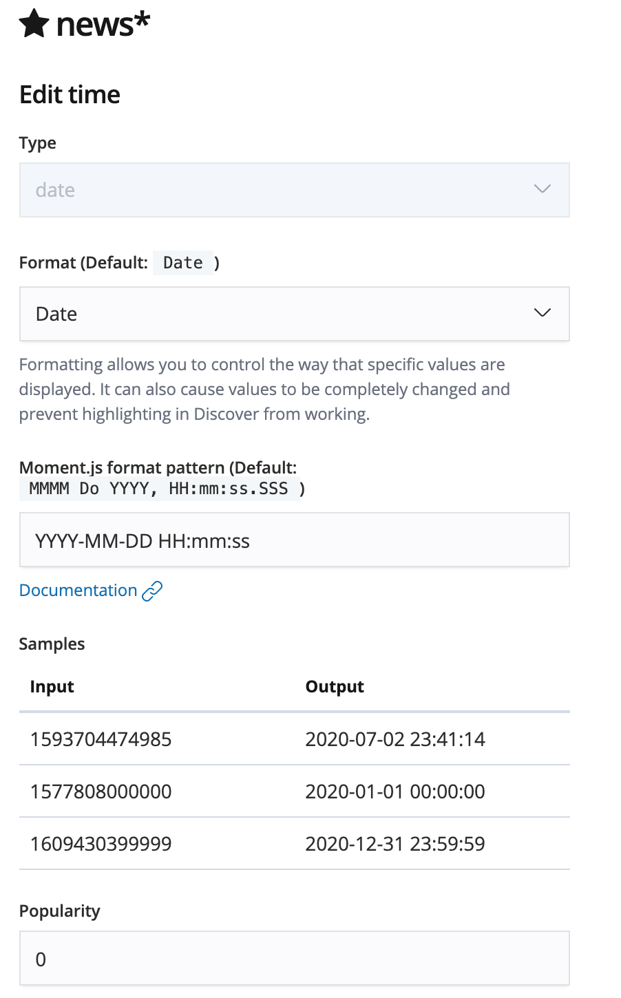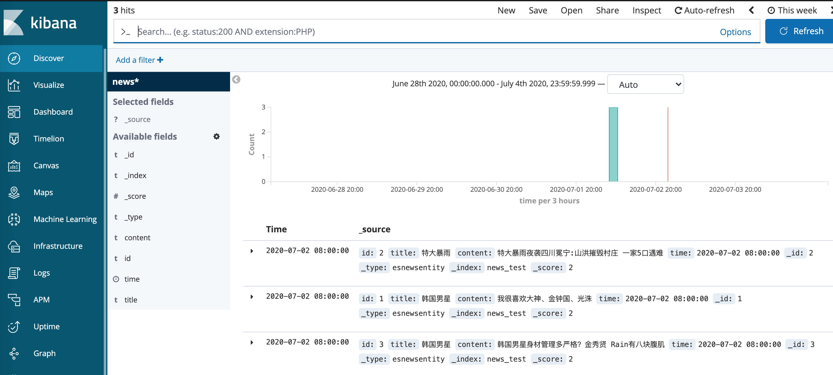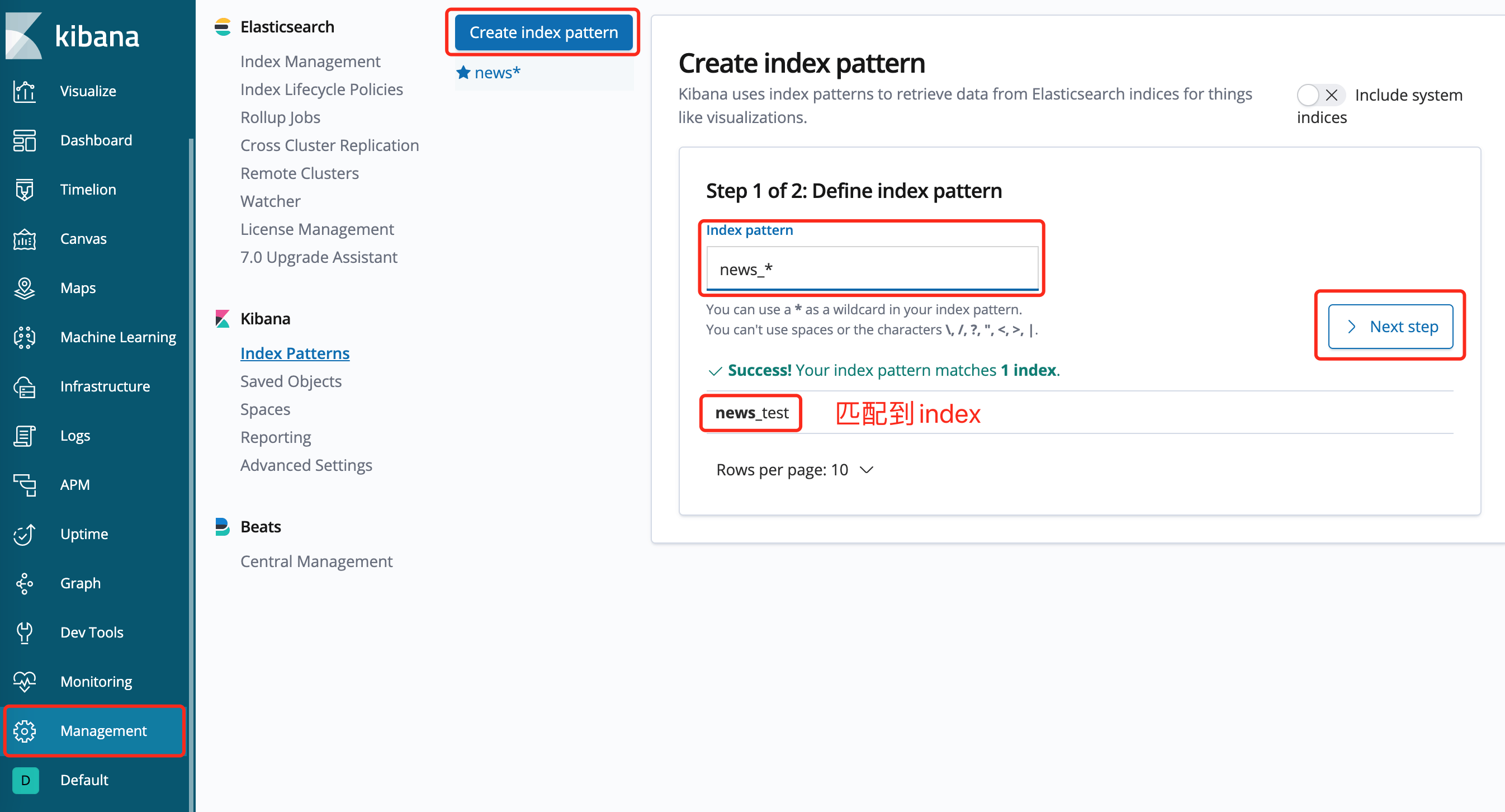 运行之后,在 Kibana->Management->Create index pattern,输入上面 News 的 indexName:news_test,设置 Date 为时间索引。