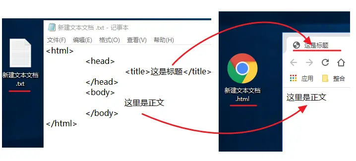 在记事本中编写好代码后,将.txt后缀名改成.html,最后直接用浏览器打开即可。