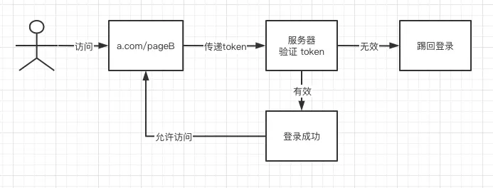 a.com/pageB时,带上第一次登录时获取的 Token。 - 服务器端验证 Token ,有效则身份验证成功。