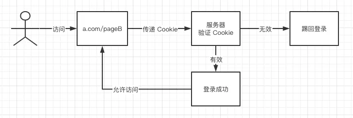 a.com/pageB页面时,会自动带上第一次登录时写入的 Cookie。 - 服务器端比对 Cookie 中的 SessionId 和保存在服务器端的 SessionId 是否一致。