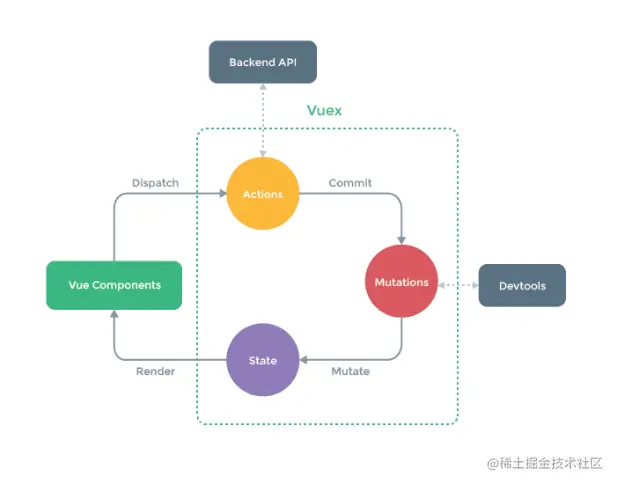 上图很好的解释了Vuex的特性,在解释图片想要表达的意思之前我们先来解释下图中出现单词都代表什么角色。