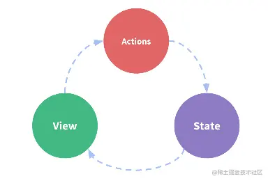 state,驱动应用的数据源;view,以声明方式将state映射到视图;actions,响应在view上的用户输入导致的状态变化