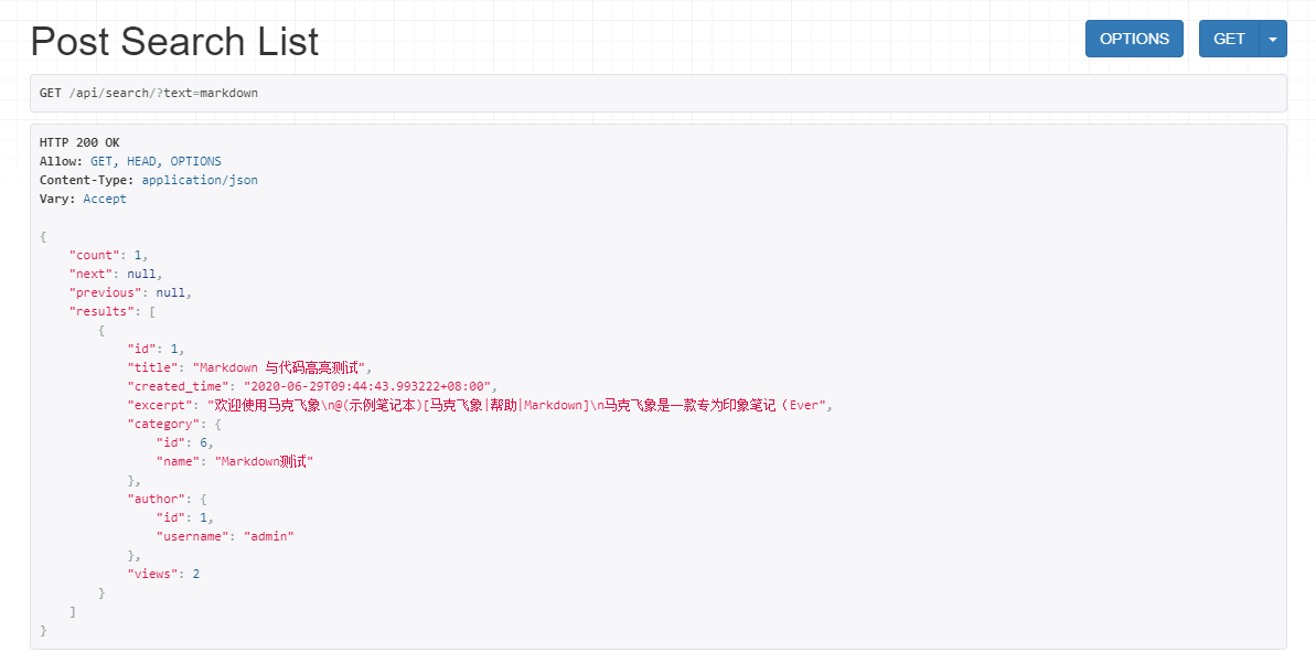现在万事具备了,数据库中已经有了文章,搜索服务已经有了文章的索引,只需要等待客户端来进行查询,然后返回结果。所以接下来就进入到 django-rest-framework 标准开发流程:定义序列化器 -> 编写视图 -> 配置路由,这样一个标准的搜索接口就开发出来了。