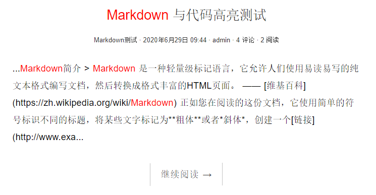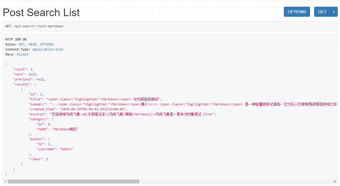 注意观察返回的 title 和 summary,我们搜索的关键词是 markdown,可以看到所有 markdown 关键字都被包裹了一个 span 标签,并且设置了 class 属性为 highlighted,只要设置好 css 样式,页面所有的 markdown 关键词就会显示不同的颜色,从而实现搜索关键词高亮的效果了。
