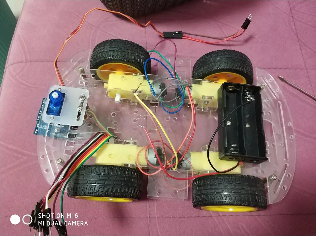 ok,如果线接好了、代码录入了,装上电池就可以使用app的避障,“开始”和“结束”按钮,来运行了。 不出意外,你的小车就有了简单的避障功能了。故障👏!!!