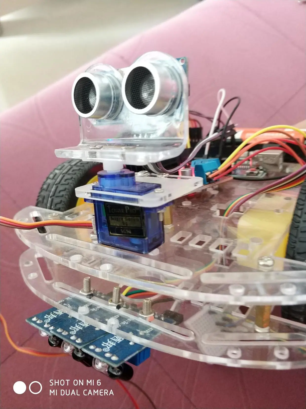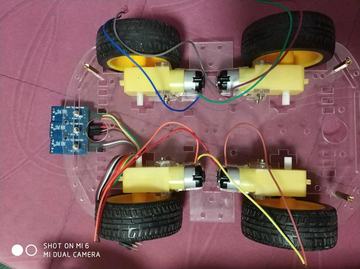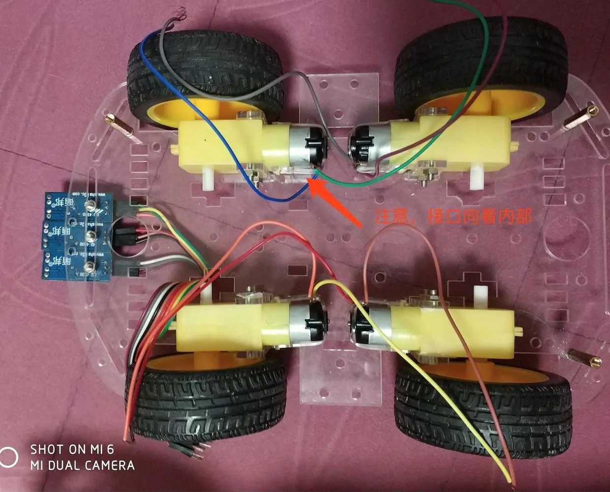 1、首先按照小车的说明书把小车的马达和轮子都依次装上去,如图