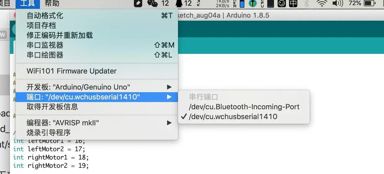 我们这里如果接入了蓝牙的RXD、TXD的时候,如果想要连接arduino和电脑进行代码写入,是不行的。因为,如果蓝牙占用了RXD和TXD,没有办法写入了。拔掉一个,然后就可以了。