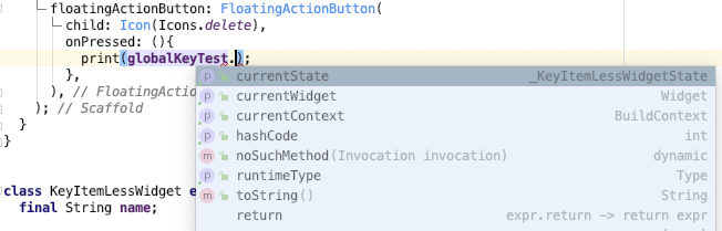 GlobalKey 使用了一个静态常量 Map 来保存它对于的 Element,可以通过 GlobalKey 找到持有该 GlobalKey 的 Widget、State 和 Element。如下图自动提示信息。