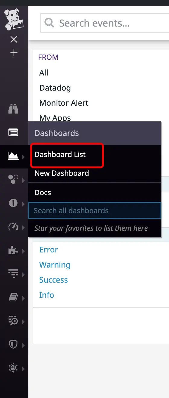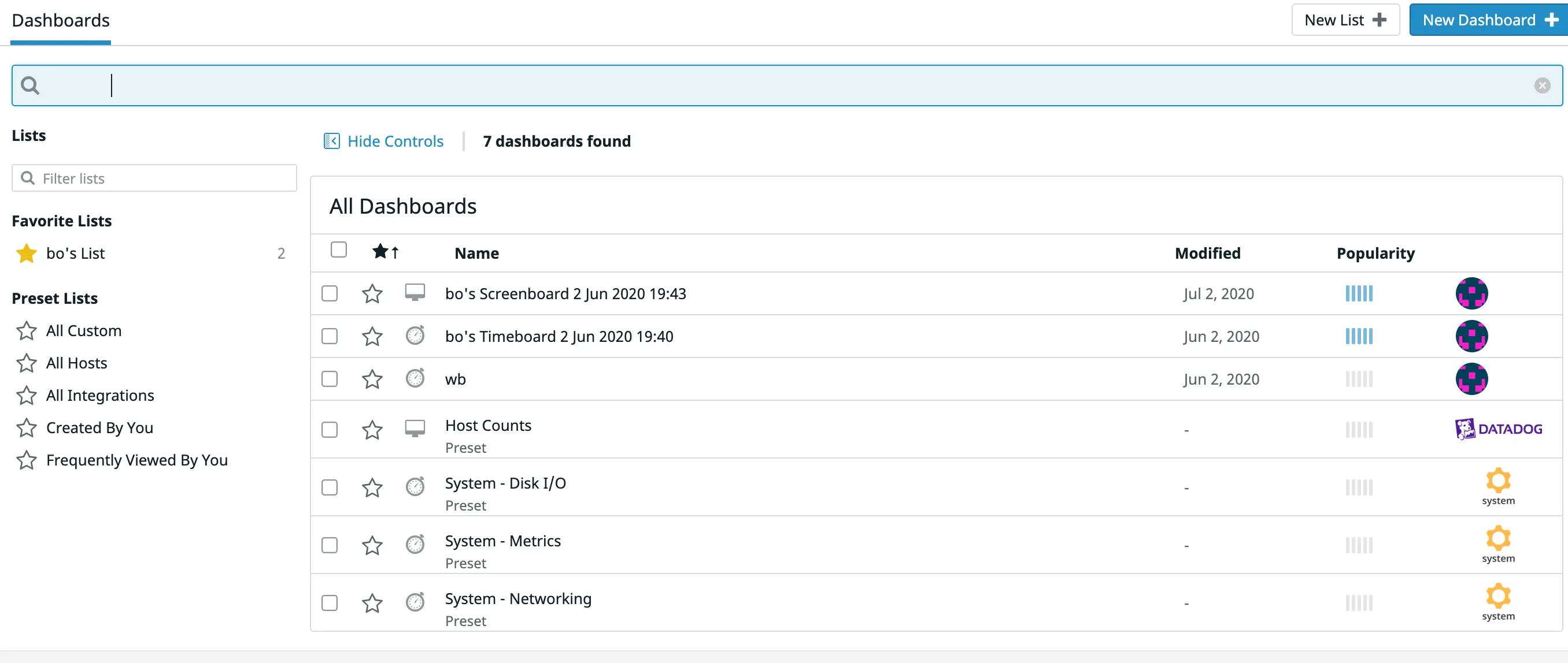 在“Dashboard List”页面上搜索、查看或创建仪表板和列表。