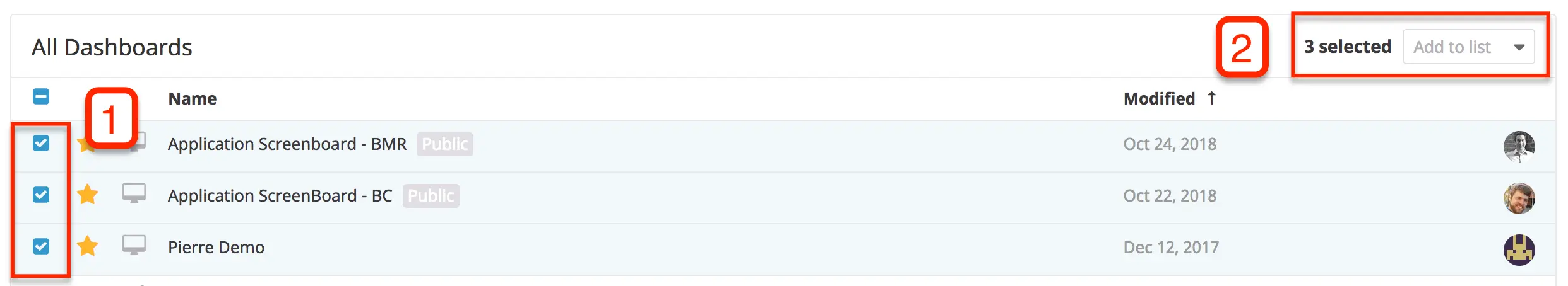 若要将仪表板添加到列表中,请在主仪表板列表中选择相应的复选框。然后单击仪表板列表右上角的Add to List按钮。