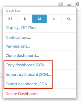 从单个仪表板中,您可以使用设置cog(右上)和以下选项复制、导入或导出仪表板的JSON。