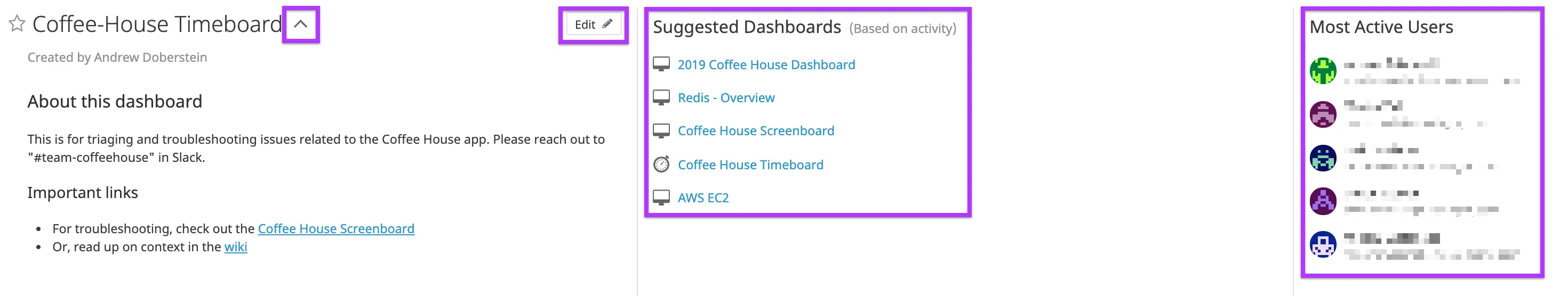 Datadog从单独的仪表板提供查看推荐仪表板。要查看推荐的仪表板和活动用户,单击仪表板标题旁边的插入符号图标。建议根据组织中的用户活动以及用户从该仪表板切换到其他现有仪表板的频率使用这些仪表板。您还可以通过单击edit在此视图中添加或更新支持markdown的仪表板描述。