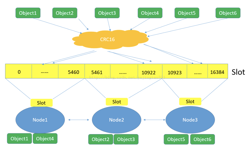 1, 对象保存到Redis之前先经过CRC16哈希到一个指定的Node上,例如Object4最终Hash到了Node1上。