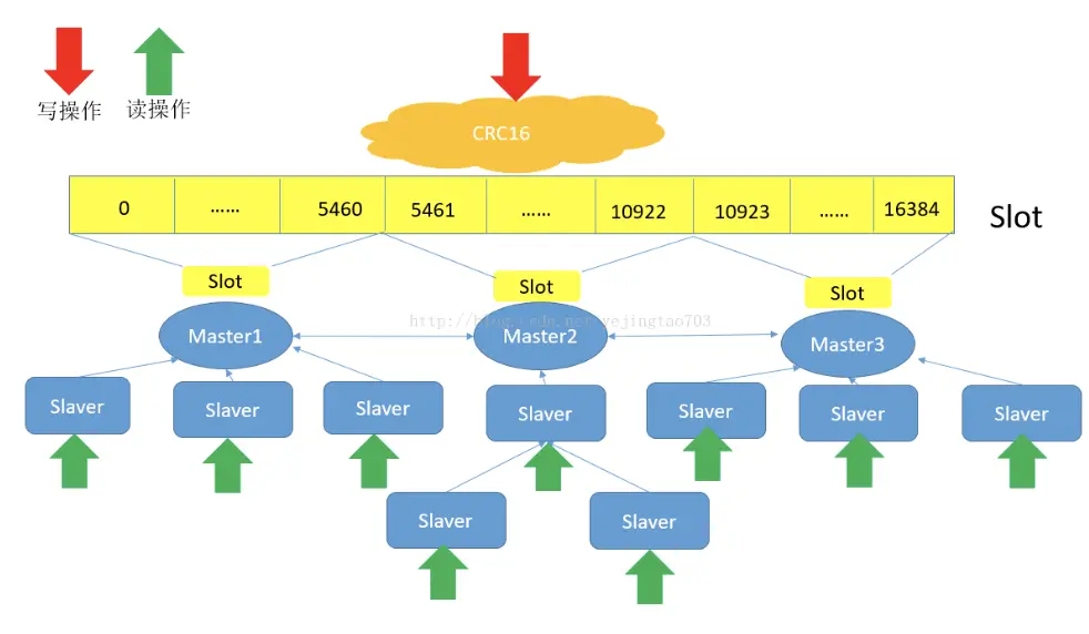 在redis的每一个节点上,都有这么两个东西,一个是插槽(slot),它的的取值范围是:0-16383。还有一个就是cluster,可以理解为是一个集群管理的插件。当我们的存取的key到达的时候,redis会根据crc16的算法得出一个结果,然后把结果对 16384 求余数,这样每个 key 都会对应一个编号在 0-16383 之间的哈希槽,通过这个值,去找到对应的插槽所对应的节点,然后直接自动跳转到这个对应的节点上进行存取操作。
