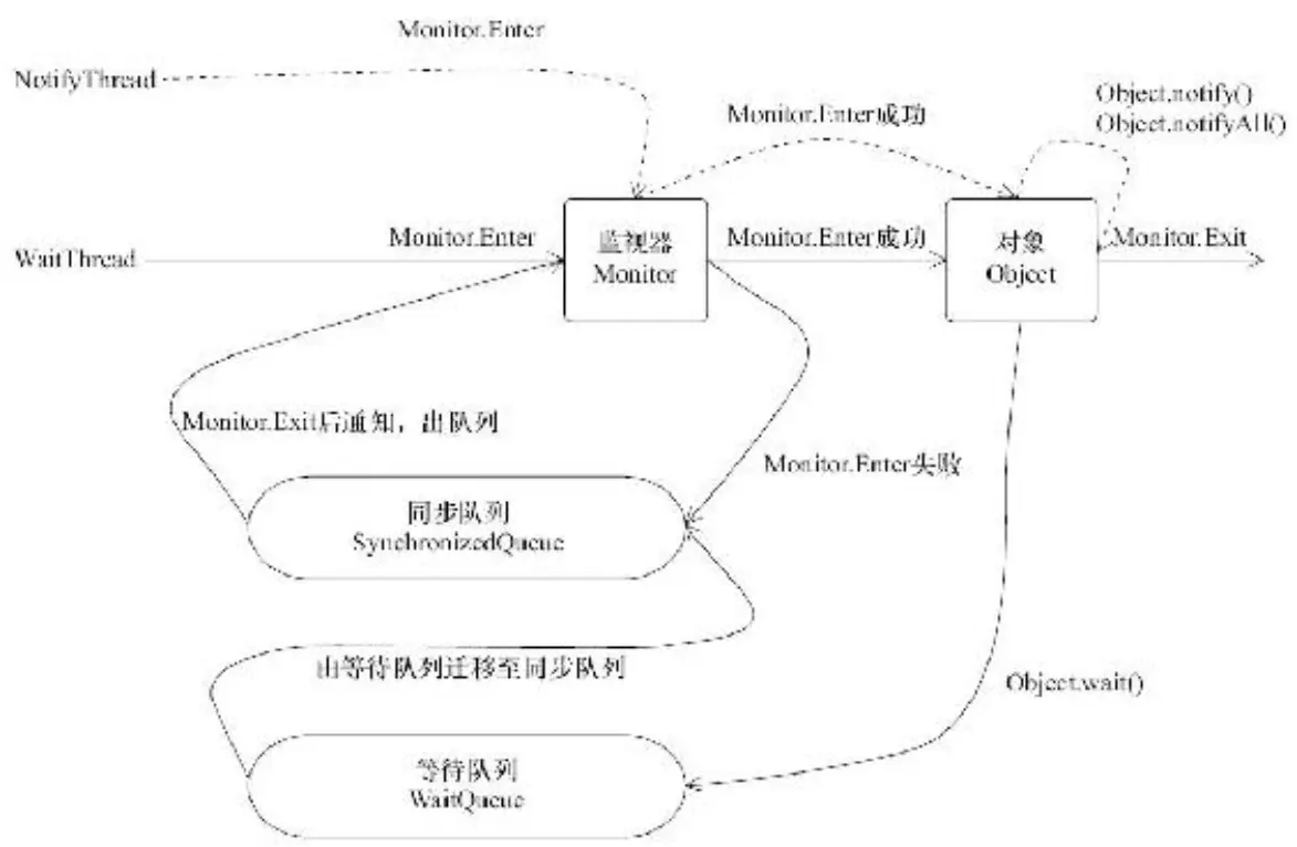 wait()方法,从而放弃了锁并进入了对象的等待队列WaitQueue中,进入等待状态。由于WaitThread释放了对象的锁,NotifyThread随后获取了对象的锁,并调用对象的notify()方法,将WaitThread从WaitQueue移到SynchronizedQueue中,此时WaitThread的状态变为阻塞状态。NotifyThread释放了锁之后,WaitThread再次获取到锁并从wait()方法返回继续执行。