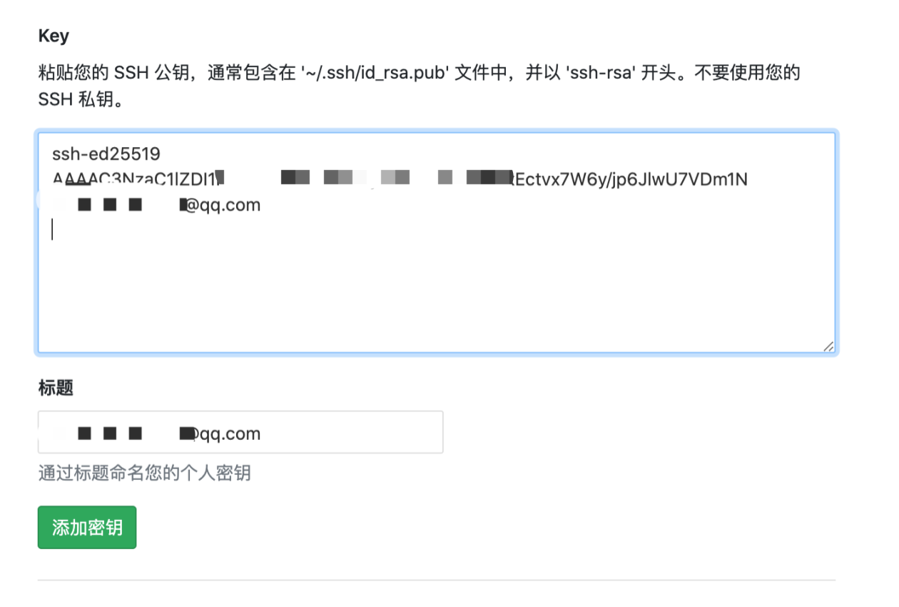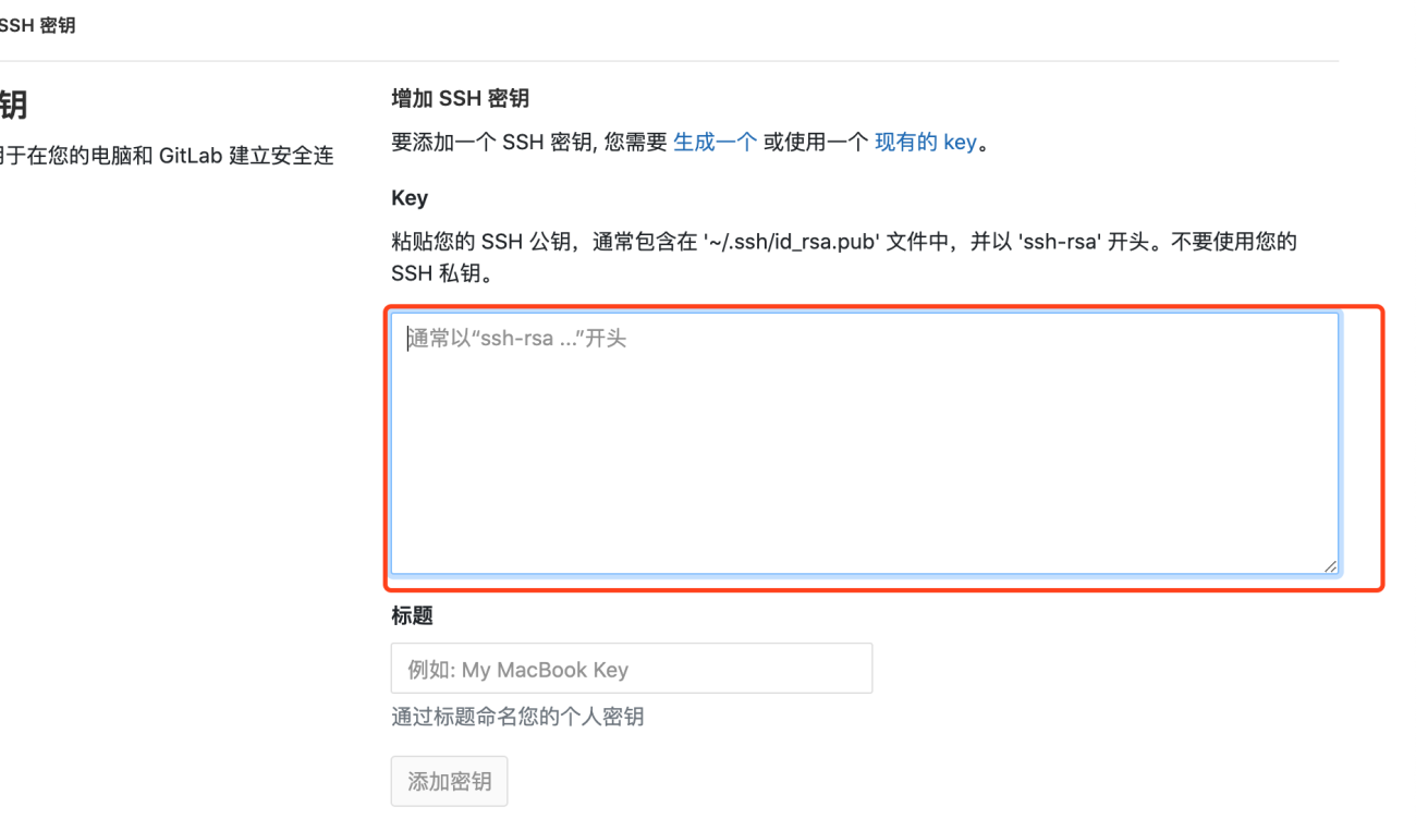 回到GitLab ssh配置页面,直接粘贴 标题默认是以你的邮箱作为标题,你可以自行决定修改与否,只是用来显示以示区分
