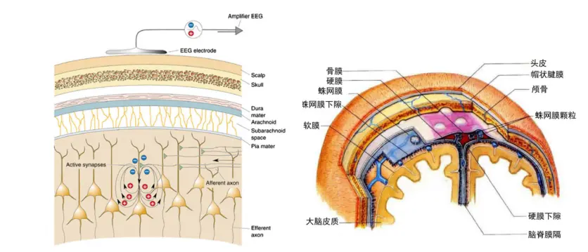 图4. 脑电信号的产生及人类头部皮层结构示意图