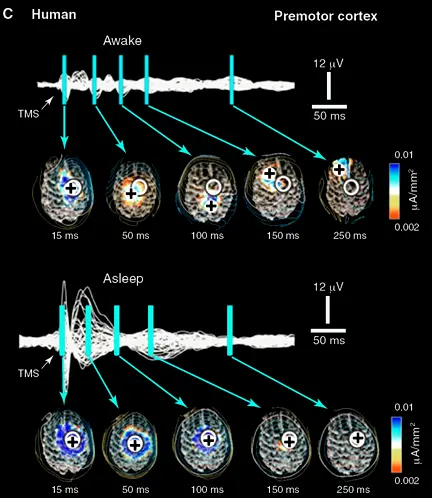 图9. 使用经颅磁刺激(TMS)+高密度脑电阵列探测睡眠时人脑的活动规律和特点