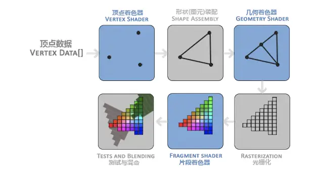 - 片元着色器对像素进行处理,赋予正确的颜色,经过混合与测试,得到位图,放入帧缓冲区