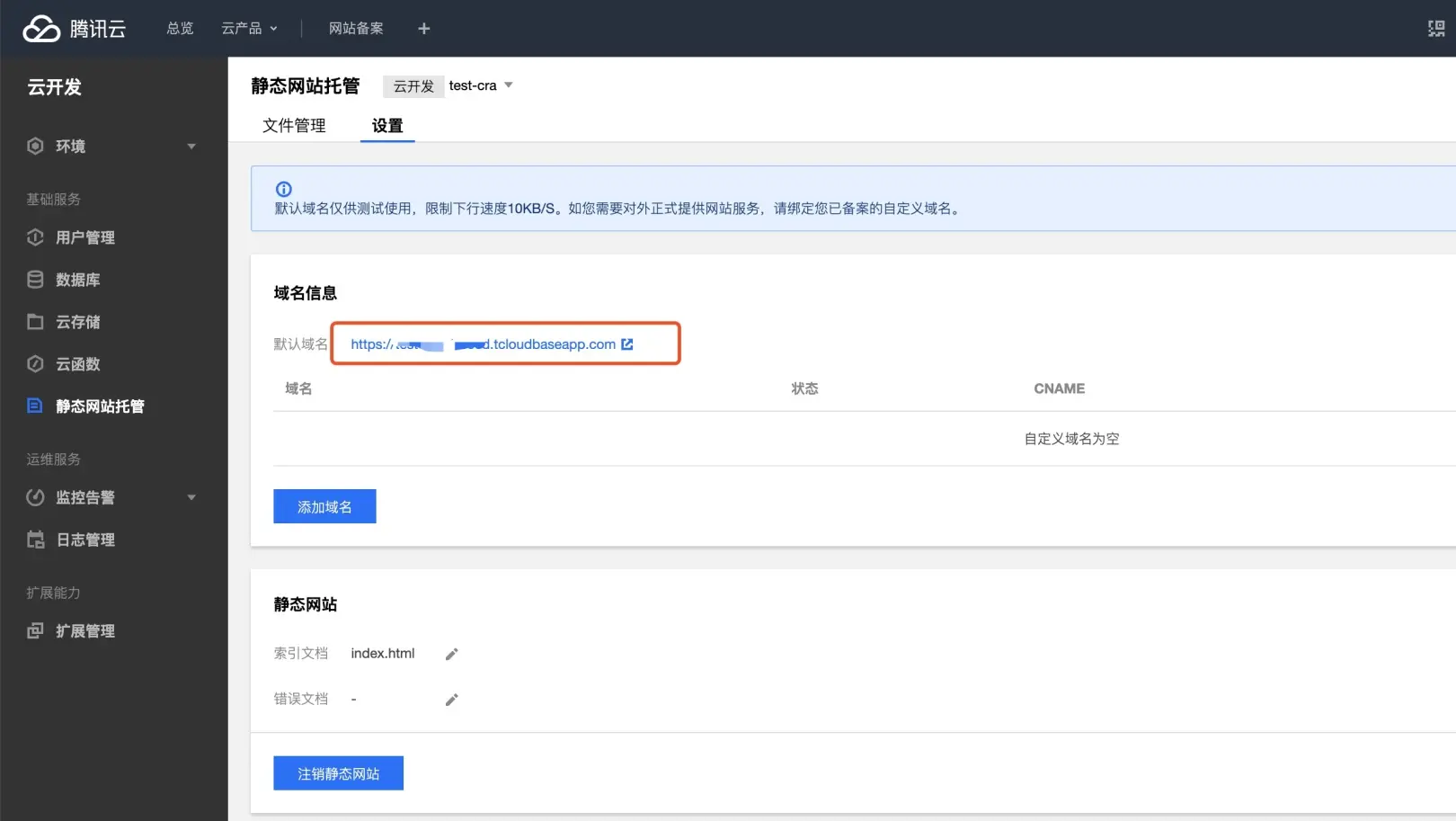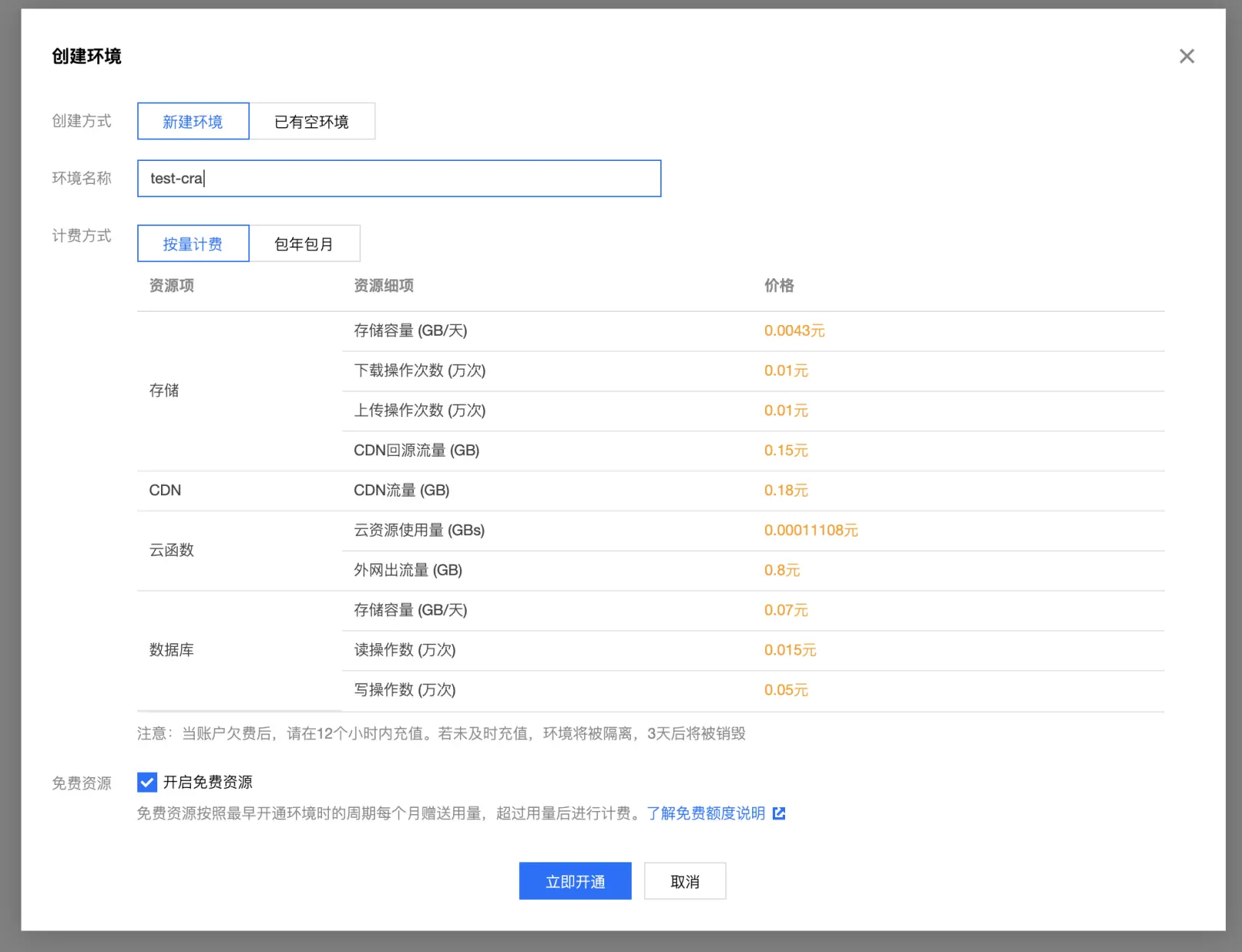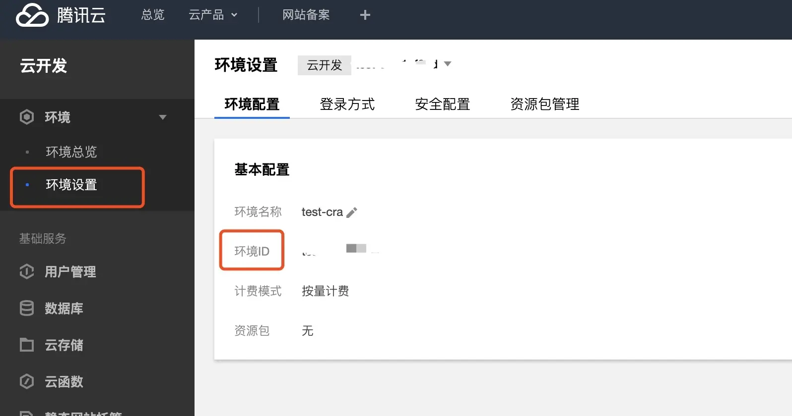 创建一个云开发环境。这里命名环境为test-cra。