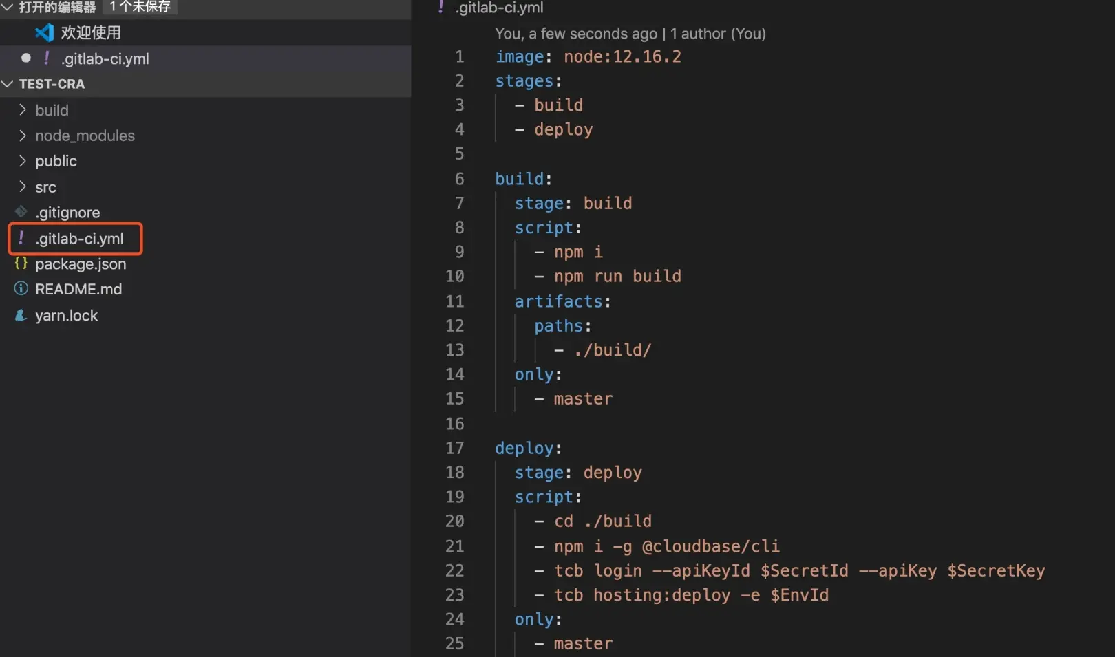 在本地工程_test-cra_的根目录中创建.gitlab-ci.yml文件