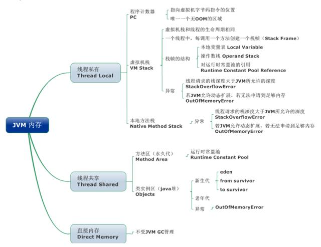 JVM 内存区域主要分为线程私有区域【程序计数器、虚拟机栈、本地方法区】、线程共享区域【JAVA 堆、方法区】、直接内存。