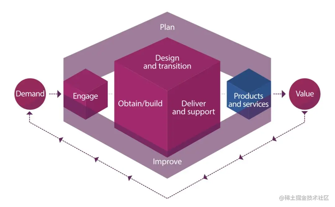 ITIL 4 引入了服务价值链的概念,表示任何活动——每个人从单个开发者到整个企业——都可以为客户创建有价值的产品和服务。