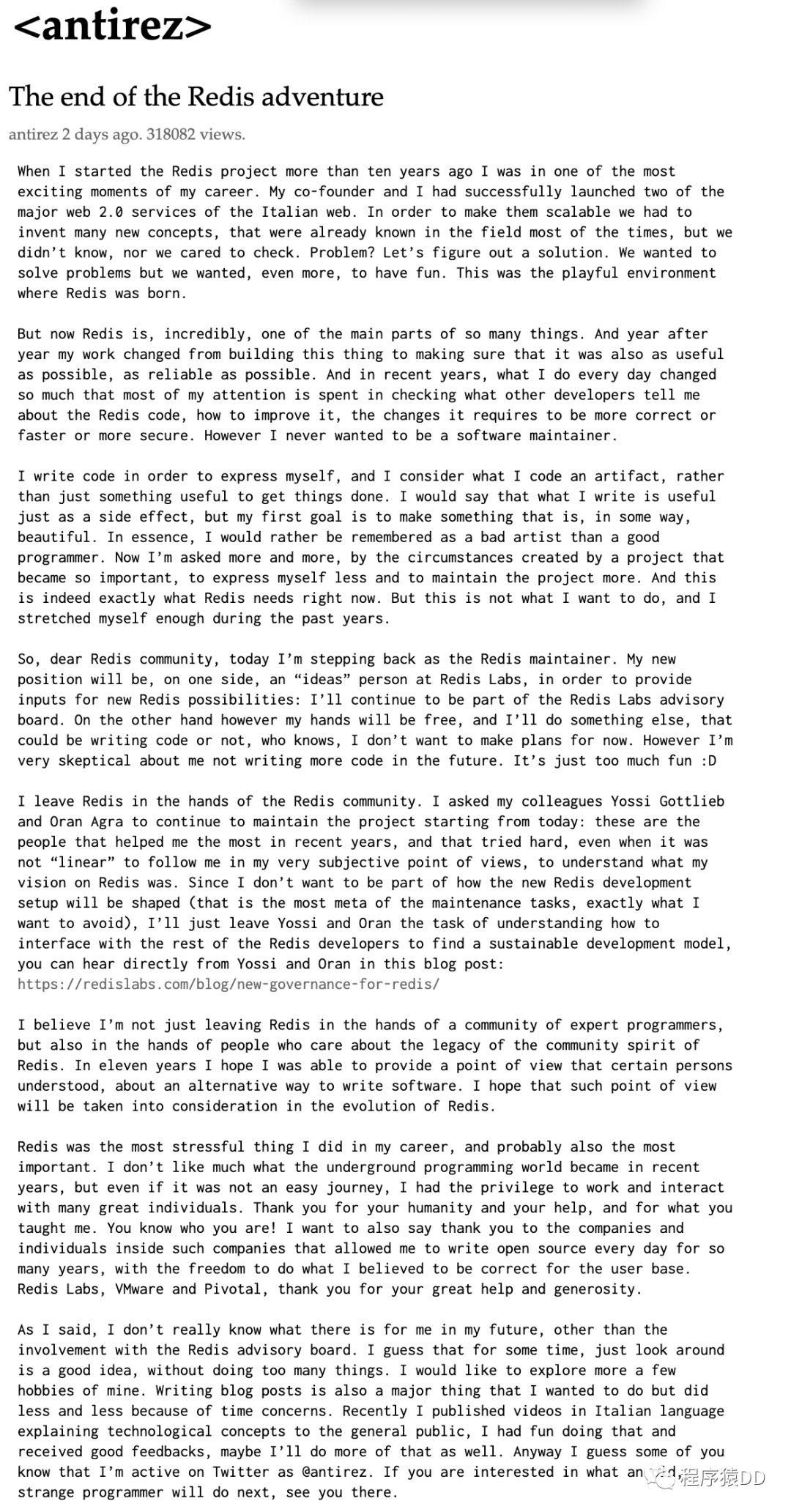 前几日,Redis 创始人 Salvatore Sanfilippo 在他的个人博客(antirez.com/)上宣布将结束自己的 Redis 之旅!