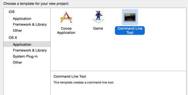 选择 OS X -> Application -> Command Line Tool,点击 Next 到下一步: